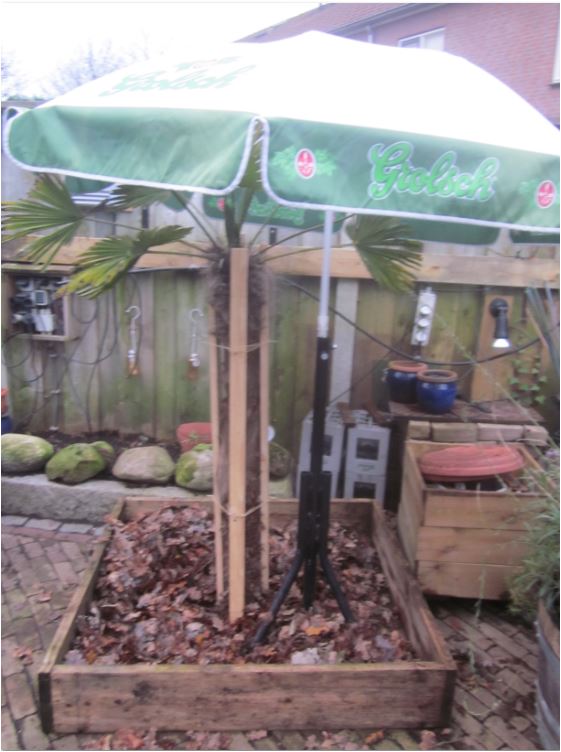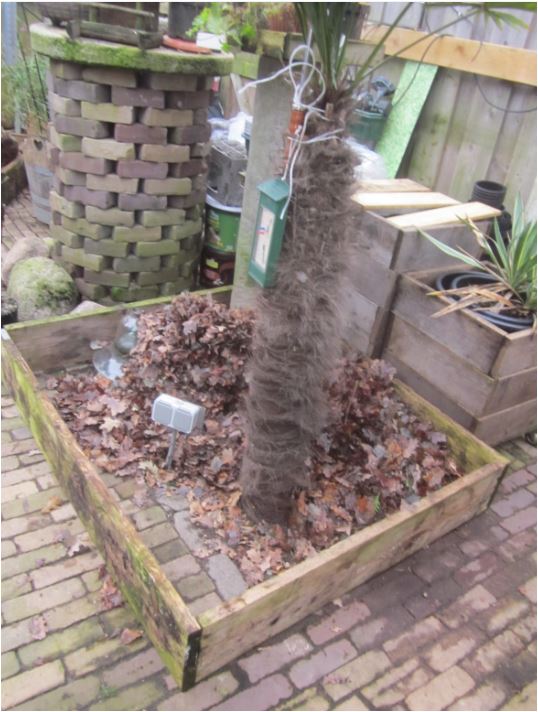 Wat wordt er allemaal beschermd : verschillende soorten Trachycarpus (Fortunei, Wagnerianus, Kumaon, Nainital, Martianus, Princeps ), Brahea armata, Butia capitata, Chamaerops humilis , cerifera en vulcano, Musa basjoo en sikkimensis, Sabal minor en palmetto.