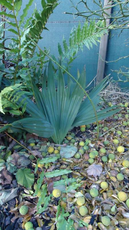 Een van m'n Butia Eriospatha's, foliehokje met aan de binnenkant vliesdoek, de palm zelf is ook luchtig ingepakt en daaromheen zit een lichtslang, aan de voet ligt een flinke laag bladafval. De onderkant en aan de bovenkant van het hokje (onder de flap) zitten openingen voor wat ventilatie. Dit gaat al 2 winters goed dus heb hier vertrouwen in.