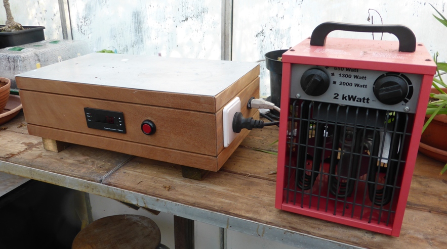 Voor het ontkiemen van warmtebehoeftige zaden heb ik een onderzetter gemaakt met een electronische regelaar die tot op een graad nauwkeurig in te stellen is. Een potentiaalvrij contact schakelt een verwarmingsfolie die op een aluminium plaat is geplakt. De regelaar blijkt de temperatuur niet erg nauwkeurig te meten, maar dat is niet erg want ik controleer op de temperatuur van de potgrond met een apart thermometertje en stel de regelaar daar op in. De temperatuursensor zit tegen de aluminiumplaat geschroeft: