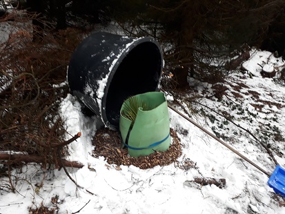Onder de kuip, van binnen naar buiten: palm, houtsnippers en groene sparrentakken om de voet, oude speeldeken, schuimmatje, palmenkuip zonder contact met de bladeren, sneeuwlaag. Om de oostenwind die toch nog door het bos kwam te breken, heb ik aan de noordoostkant sparrentakken tegen de kuip gestapeld. Daaroverheen nog sneeuw. De kuip stond deels op een tak, daardoor was er van onder een ventilatieopening, aan de bovenkant heb ik voor de ventilatie wat afwateringsgaten van de kuip onder de sneeuw vandaan geveegd.