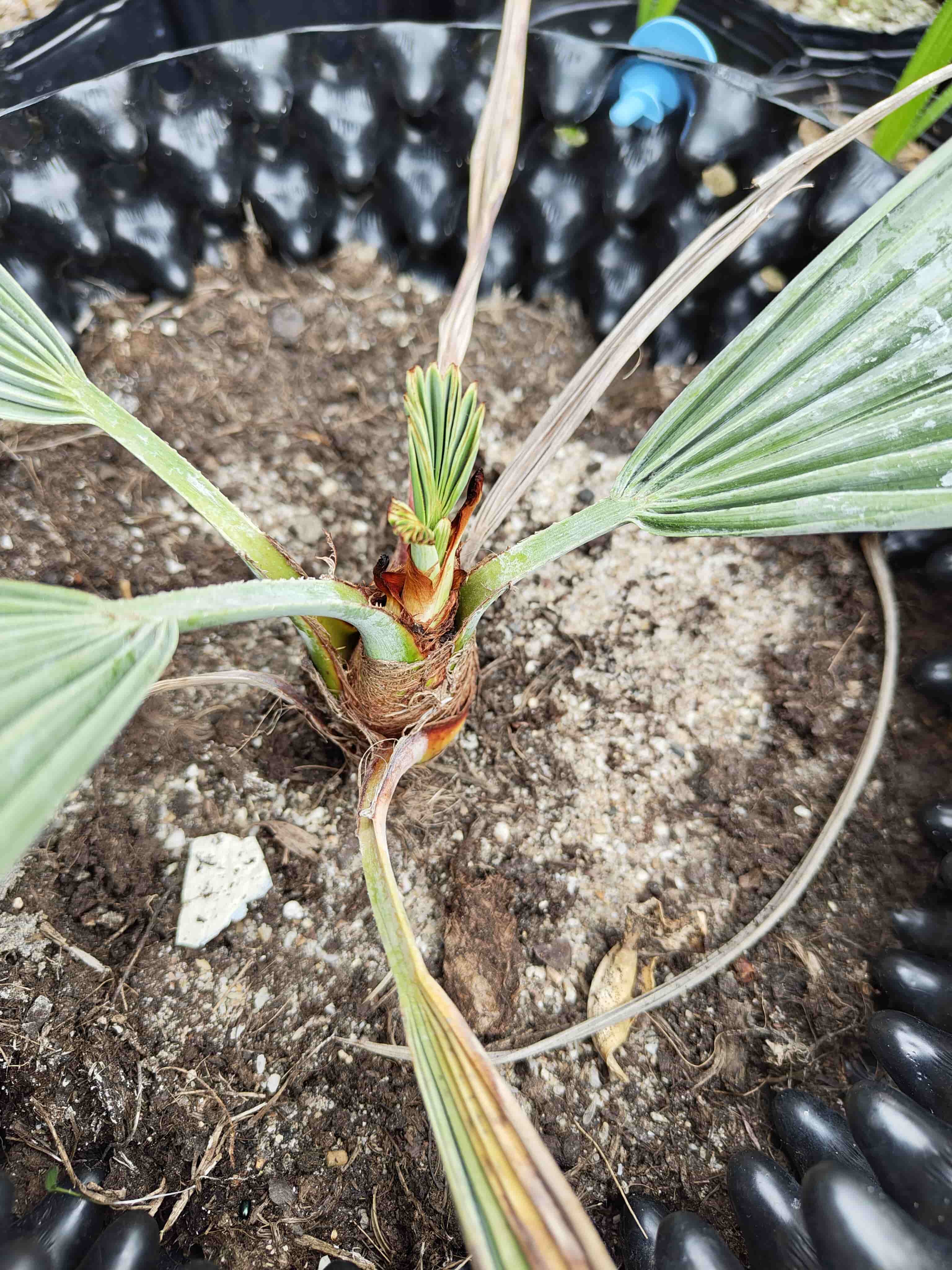 Hier gelukkig 2 voorbeelden van palm (zaailingen) die speerrot te boven komen, stonden de hele winter in de koude kas, waarschijnlijk iets te vaak de deur en raam dichtgehouden, waardoor te vochtig gebleken. Betreft de Phoenix D. en Brahea Armata.