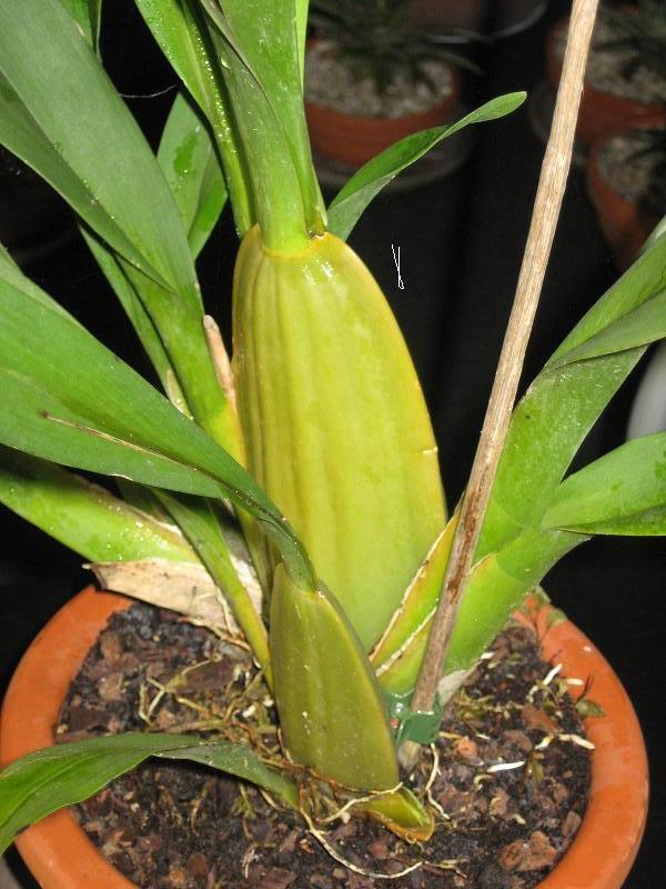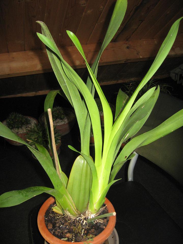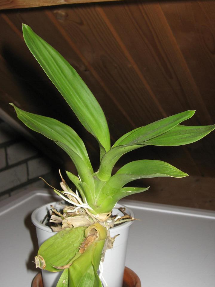 orchideen is eigelijk bulben(grote uien ;) )kweken als die groot en stevig zijn dan komt er ook mooie en grote bloemstengels.ik zou nu niets doen en over 1/1,5maand nieuwe grond geven(orchideeengrond).en dan water en een beetje voergeven tot de bulben uitgegroeit zijn ik denk ongeveer oktober/november en dan wat koeler wegzetten en minder water geven en als het goed is komt er in februari/maart een nieuwe bloemknop in.en de soort kan ik niet veel over zeggen het kan er zo veel zijn :D