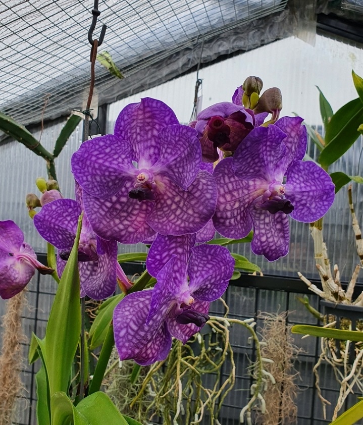 Vanda Rothschildiana gaat met 2 takken bloeien in de nok van de kas.