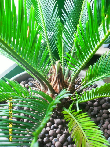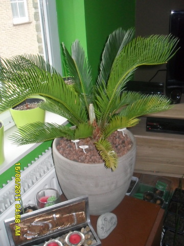 Ook heb ik nog een kleine cycas die zijn eerste bladeren gooit.