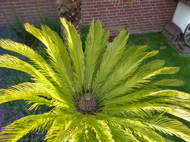 De Cycas hier heeft zowat de hele winter buiten gestaan en staat vol in de zon ( dat is hier met deze zomer zo ongeveer een half uur per week 8-) )