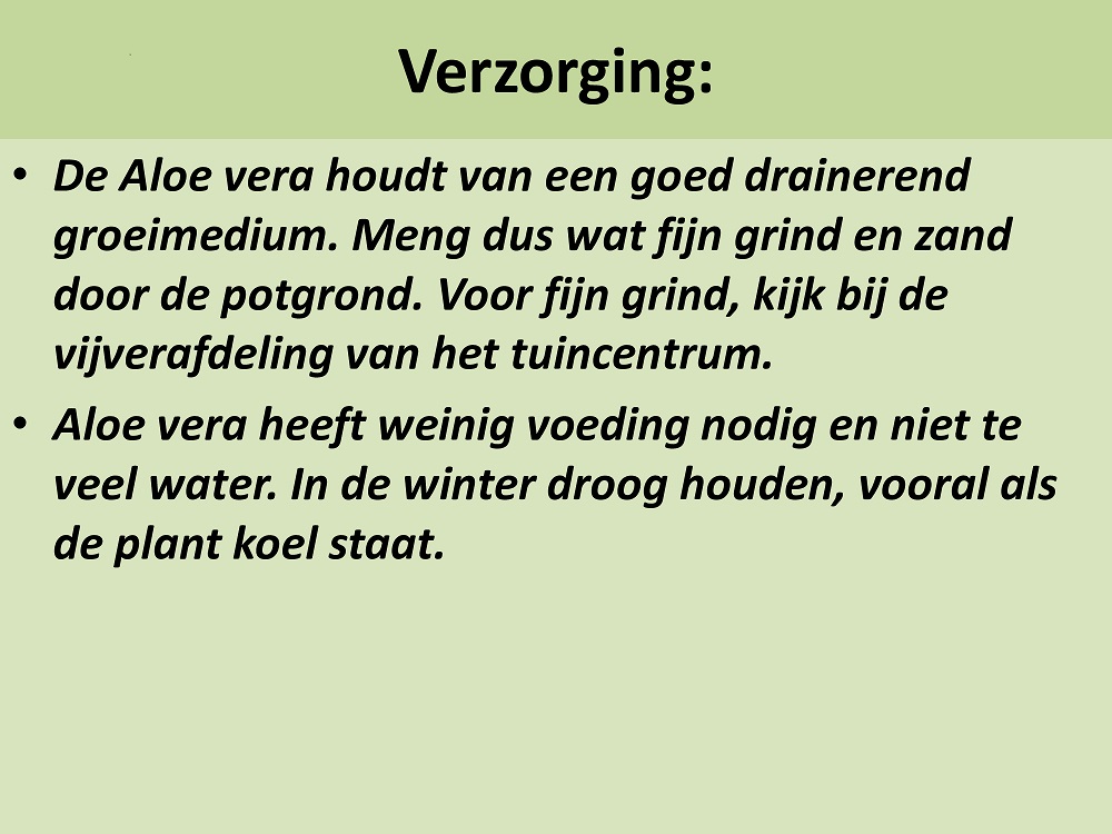 Het recept voor een gezonde Aloe plant is verwaarlozing. Laat hem maar rustig een beetje verdrogen. Aloe houdt van warm en zonnig.