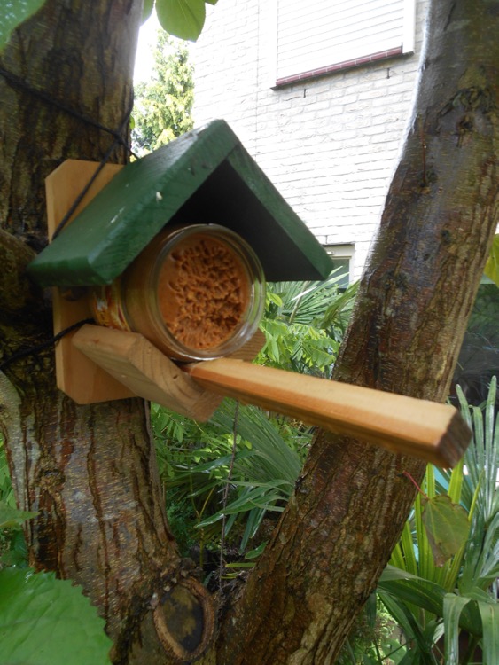 We verwennen onze tuinvogels ook in de zomer en het lijkt hier soms wel een voliere. Een van de geregelde bezoekers is de grote bonte specht die laatst gedrieën, pa, ma en jong kwamen fourageren. Omdat de eksters die achter de tuin een nest hebben, de pindabar plunderden, gaat deze ’s nachts dicht. Vanmorgen echter zat er een gat in de deksel waardoor een naaktslak naar binnen was gekropen. Vermoedelijk heeft de specht het gat veroorzaakt? :lol: Grappig is dat de mussen soms in een wachtrij op de stok zitten tot ze aan de beurt komen.