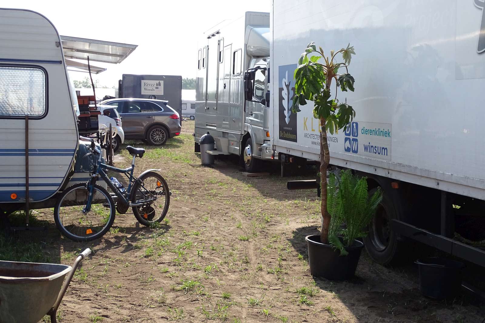 Zo gezegd zo gedaan. Ik werdt door mijn vriendje op de scooter bij de weg af gezet en daar hoefde ik maar even te wachten tot Herman er was. Vrolijk in de auto gestapt bij een wildvreemde man ha ha en op naar de tetrapenax. Deze had Herman er snel uit en samen met 2 mooie varens werdt alles in de auto gestopt. De stam was zo mooi lang dat ik niet eens meer voorin de auto paste. Dus als een prinsesje achter in en op naar het wedstrijd terrein. Hier was het zo stoffig dat ik Hermans mooie auto er niet aan durfde te wagen, dus...... kwam mijn vriendje met de kruiwagen EN de ruilhandel naar de weg gelopen. Met de prachtige plant in de kruiwagen moesten we het hele terrein over, tot grote hilariteit en nieuwschierigheid. Want hij viel wel op tussen alle koetsen en paarden. Het enige nadeel was dat we nog 3 dagen bivakeerden en in Horst en dus heb ik liters water bij de bak in gedaan om hem maar in leven te houden. Zoals te zien op de foto's had de plant er absoluut heen probleem mee om op de camping te staan.