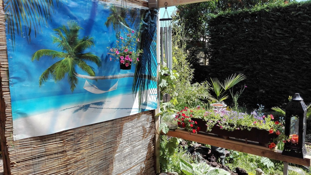 Plastiek dakje met rietbedekking en rechts bamboe met wisteria over het dak in de toekomst. Links oogt nog niet zo mooi omdat daar de begroeiing zijn werk nog moet doen. Pagina 7 heb je een idee