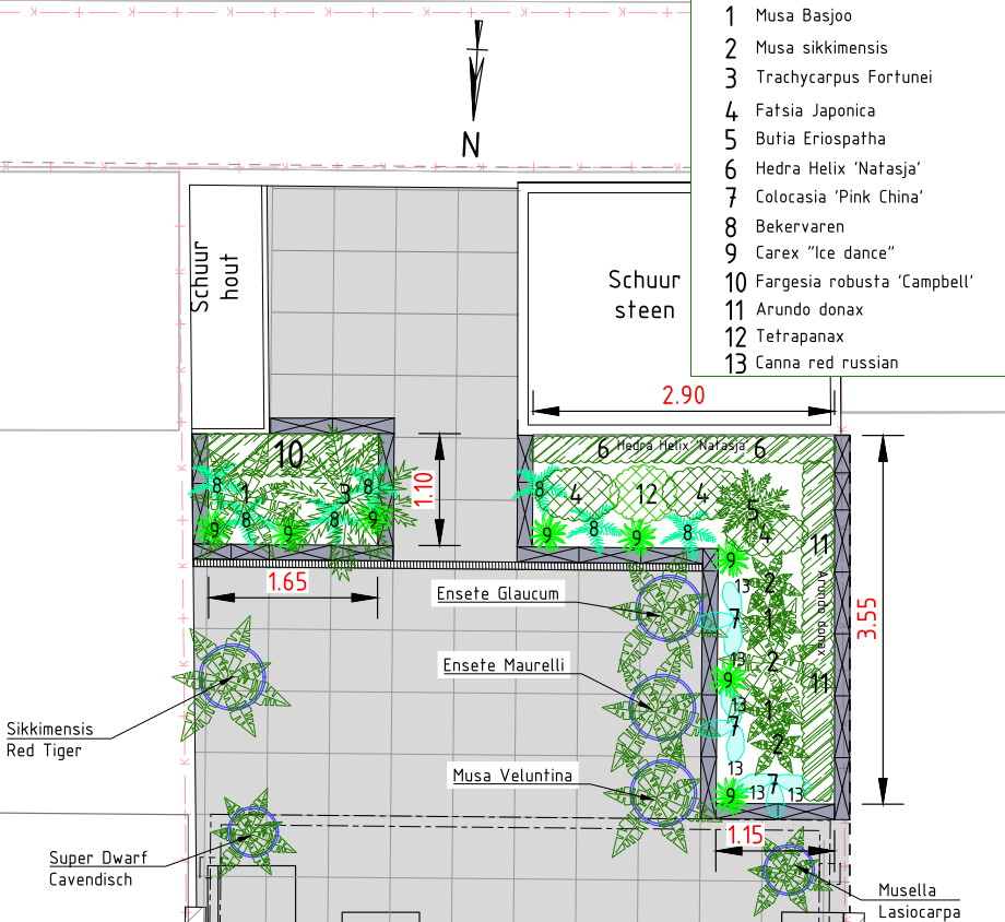Zelf zat ik ook nog te denken aan een Phylostachys soort. Maar mijn idee is nu om (smalle) groene wanden achter de bananen te creëren met meer hoogte dan bananen. Met deze gedachten denk ik dat het voor bamboe een te smalle strook is en dat bamboe ook te veel door de tuin gaat lopen. En zon strook bamboe word natuurlijk ook al weer vrij prijzig.