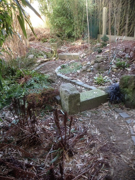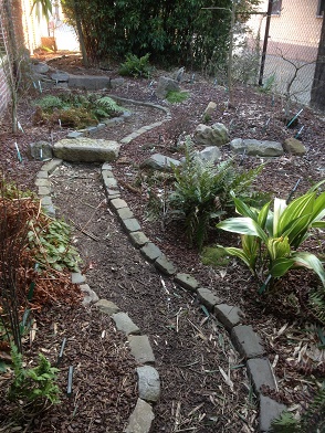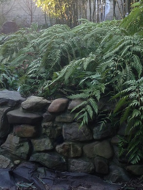 Fraai bestand met Woodwardia en de natuurstenen combineren uitstekend met varens en bamboe. Wat ik niet begrijp is het pad met de dwarsliggers. Bedoeld voor een hordenloop :D