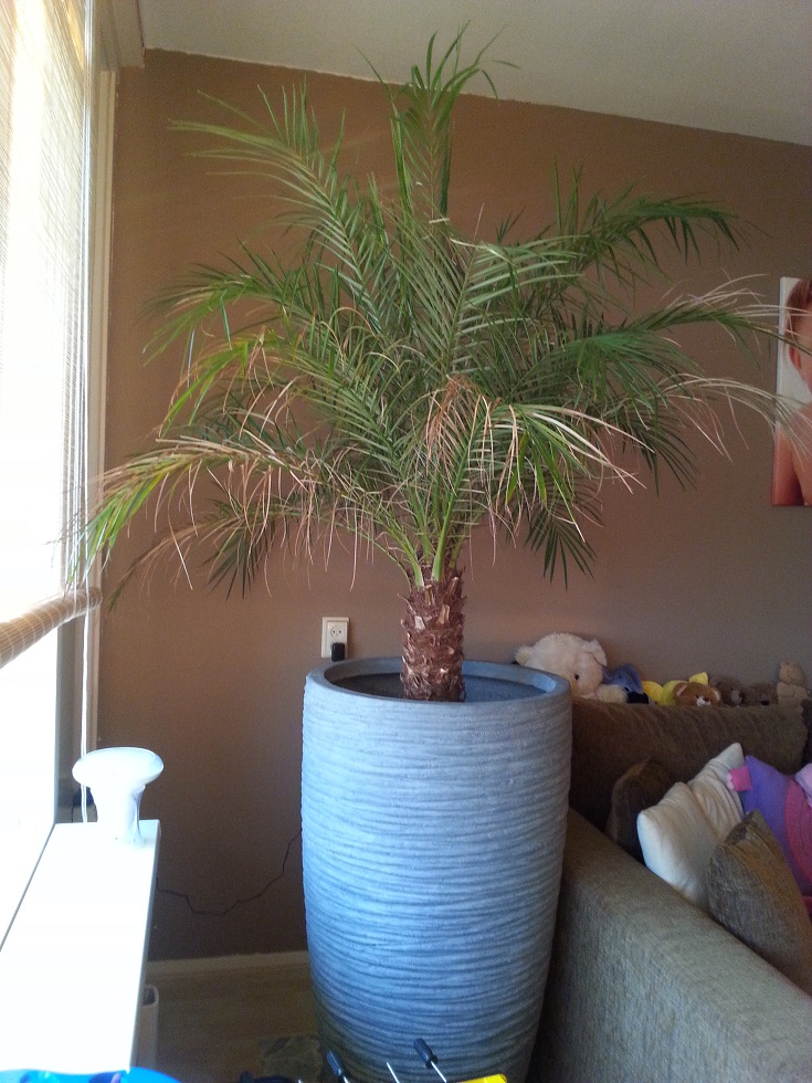 Per ongeluk zo'n 2l hydro korrels op de bodem, kon het er niet meer uit krijgen dus laten liggen, worteldoek rondgeknipt erin gedaan, 18l hydrokorrels en daarboven 40l normale potgrond wat ik nog had staan, daarboven op 3x 40l mediterrane potgrond waar de palm nu fijn in staat. Had nog een zak bij gekund maar dit had ik niet. Opzich wel prima zo qua hoogte. Ik heb de aarde op dezelfde hoogte gedaan als hoe de palm ook in de oude pot stond. Misschien 2/3cm hoger.