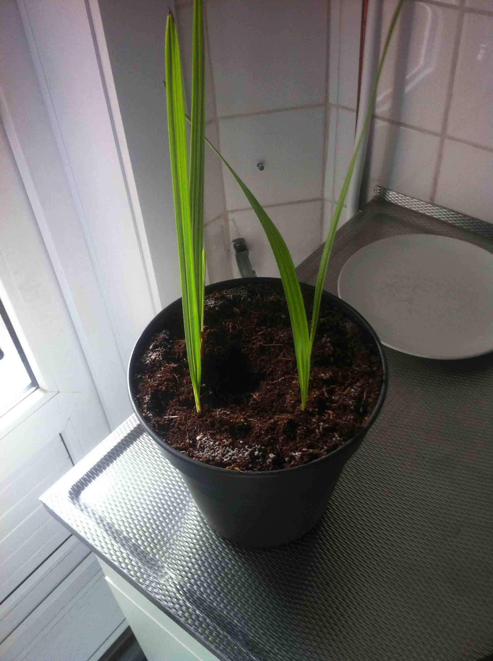 Cocos is perfect voor zaailingen het eerste half jaar of zo, maar nu wordt het tijd om de dadeltjes te verpotten naar grond waar wel voeding inzit