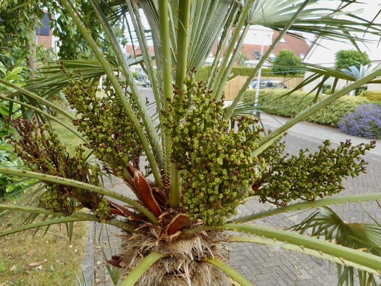 De ontwikkeling van de zaden gaat nu het snelst bij de 'raszuivere' Cerifera. Bij de andere twee Chamaerops is het aantal zygotes groter waardoor ze elkaar waarschijnlijk in de weg zitten. Ik ben benieuwd hoe dit zich ontwikkelt. De 'Arborescens' kreeg tot nu toe jaarlijks zaden zonder dat een bevruchting had plaatsgevonden. Ze bleken dan ook altijd inhoudsloos. De Cerifera vrouw leverde al eerder met succes kiemkrachtige zaden.