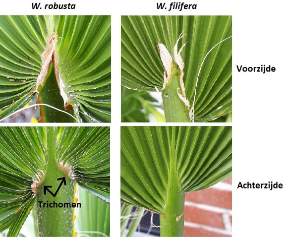 In La Connaissance de Palmiers staat ook een uitgebreide morfologische beschrijving van beide soorten, maar dat vergt wat meer studie gelet op mijn sleetse kennis van de Franse taal. Over de stam staat bij de robusta: 'le stipe et fin, gris, finement crevassé, cylindrique et elancé, de diamètre constant sauf à la base, qui est invariablement renflée'.