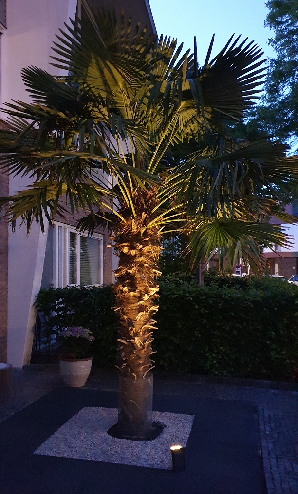 Let op! niet kopen in een tuincentrums maar gewoon ff online zoeken. Als je ook zoiets zoekt ga dan voor een Solar LED grondspot en kies voor een lichtsterkte tussen de 200 tot 300 Lumen. Dat is echt voldoende. In de tuincentrums zie je doorgaans solarspots die helaas nog steeds te weinig licht opbrengst geven. De verlichting die ik heb gevonden is tevens water bestendig (IP65) en dus nu maar hopen dat dat voldoende is. Hoe dan ook geen snoeren of kabels door je tuin. Als ik de leverancier mag geloven werkt deze oplossing over alle 4 seizoenen heen en kunnen we hier nog lang van genieten. De Trachycarpus boom op de foto is destijds in 2014 geplaatst (zie voorgaande berichten). We genieten er ieder jaar anno 2022 nog steeds volop van.