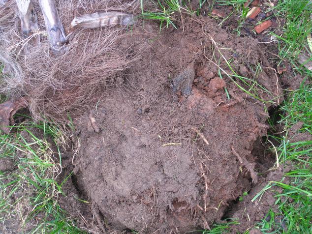 Inderdaad ook hier geen wortel te zien enkel een klomp klei ,had zelf geen schop nodig kon hem zo omver duwen en stond toch al een jaartje in de volle grond.