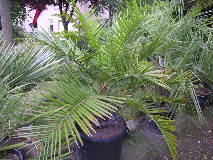 Ik vind Jubaea bepaald geen trage groeier. Trouwens als je al meer als 30 jaar palmen in kuip kweekt, heb je langer plezier van de trage groeiers. Deze Jubaea als kuipplant staat sinds de aankoop een jaar of 10 geleden voor € 80 in deze kuip en groeit met het jaar beter (sneller). Hij komt van Boevé, het inmiddels opgeheven bedrijf die de Jubaea rechtsstreeks uit Chili importeerden. Indertijd werd gezegd dat Jubaea ongeschikt zou zijn als kuipplant. Dat valt blijkbaar wel mee. Doorgaans valt het mij op dat palmen in kuip het beter doen naarmate ze niet te ruim staan opgepot en er een goede balans is tussen de het volume van de kroon en de wortelkluit. Voorkomen wordt zo dat de wortels te lang nat blijven.