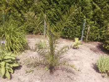 Ik schat hem zelfs nog iets jonger, aangezien het import was uit Spanje. In die delen groeien de palmen in 1 jaar op tot al een redelijk jonge plant waar wij enkele jaren over doen. Ik schat hem 5 jaar toen hij de volle grond inging en dus nu een jaar of 9-10. En een Phoenix van 9-10 jaar is in zuid europa al een flink stuk groter als dit exemplaar.