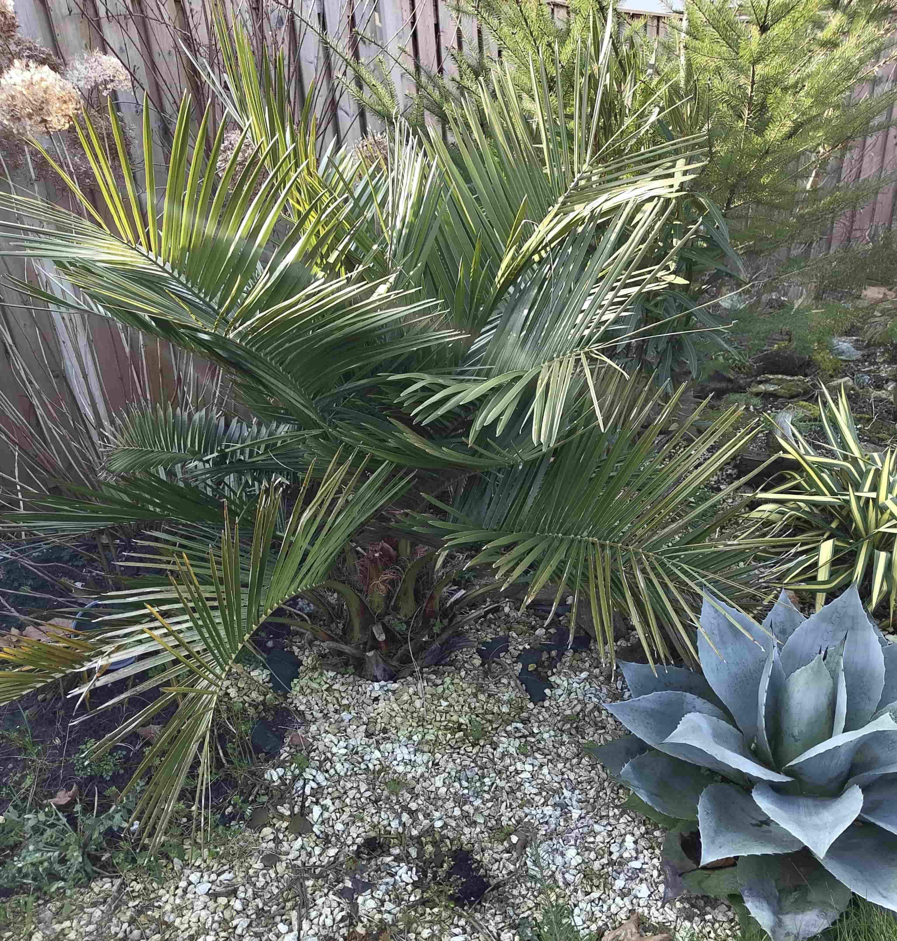 Microspadix styaat hier onder een Trachy tegen een noordmuur, Radicalis achterin tuin onder de grote eik en grote trachies.