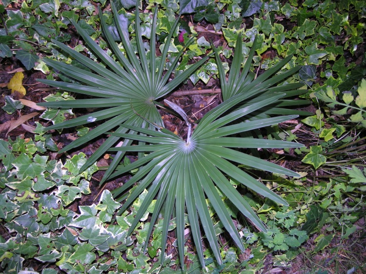 Mijn princeps staat ook te donker pal naast een Japanse esdoorn. Het was een experiment dat zeer onverwacht nog steeds loopt na alle problemen die deze palm ondervond. In het begin ging de kroon verloren, maar kwam onderuit een nieuwe loot tevoorschijn. Nauwelijks herstelt, verloor de palm in 2012 door de vorst opnieuw alle blad. Inmiddels is de princeps weer boven Jan met een 4 tal bladeren.