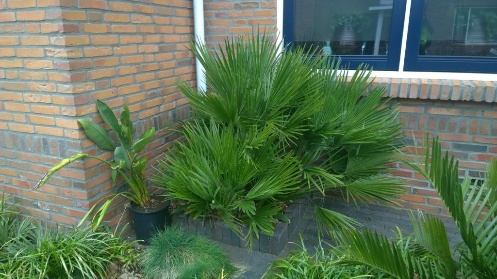 Deze chamaerops in Amsterdam groeit er al heel wat jaren onbeschermd op het zuiden.