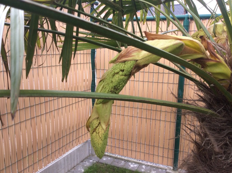 1 keer per maand (start meestal in Januari t/m Sept) vloeibare voedsel voor mediterrane planten (rode kleur flesjes). Palm is niet meer te houden en oersterk. Ding groeit zeker nu 30 Cm per jaar en de speren blijven eruit komen. Op warme zomeravonden lekker natnevelen.
