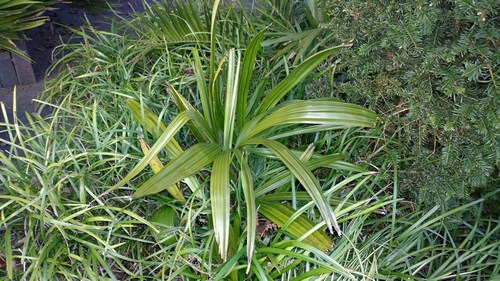 Fotootje van mijn exemplaar van vandaag. Deze bescherm ik niet, behalve dat ik wat droog blad rond de stamvoet frommel. Inmiddels is de Liriope rond de plant gegroeid tot een dichte mat rond de plant, dus echt vorst komt niet meer bij de wortels. Ook na deze winter weer geen enkele schade. Ik lees dat ik eerder schreef in dit topic dat ik twee soms drie bladeren per jaar krijg. Dat is inderdaad no9g steeds zo. Het gaat erg langzaam, maar er gaan ook eigenlijk geen bladeren dood, dus hij wordt steeds voller.