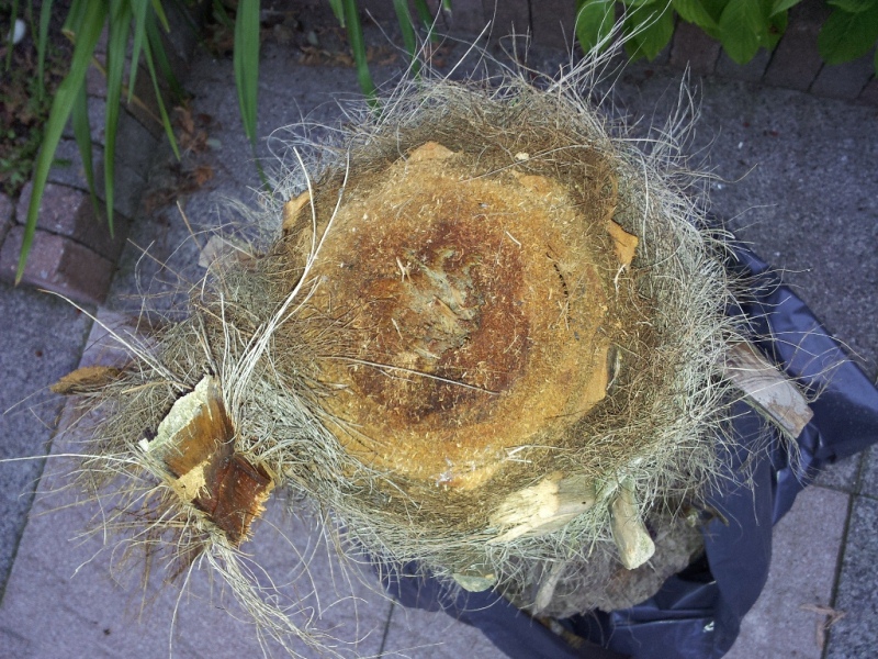 Als je de laatste mogelijkheid toepast en dus de stam gaat afzagen dan meet je de diepte van het gat door middel van er een stokje in te steken. Niet drukken zodat je het eventuele aanwezige palmhart niet doorboort natuurlijk ! Dan hou je het stokje naast de stam en weet je waar je moet zagen. De zaag erin of ik gebruik de slijpschijf