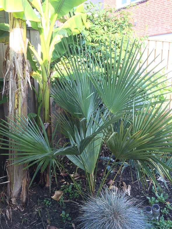 Ik heb Trachycarpus manipur lang geleden als zaailing meegenomen uit Panningen waar Herbert Riphagen er een aantal had meegebracht. Ik heb de palm jarenlang als kuipplant gehouden en pas sinds 2 jaar in de tuin geplant op een vrij ongunstige plek onder bamboe. De manipur groeit weliswaar goed, maar de bladstelen zijn vrij lang. Als kuipplant vond ik het niet de fraaiste Trachycarpus, vandaar dat de palm verhuisde naar een weinig opvallende standplaats. Of het de 'echte' manipur is, weet ik niet, wel heeft deze een zilvergrijze bladonderzijde.