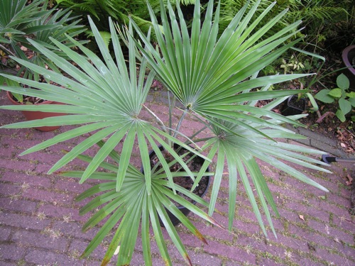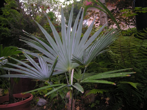 Van een recent bezoek aan het bedrijf GP heb ik onder andere een nieuwe 'soort' princeps meegenomen. Deze 'New Form' Trachycarpus (foto 1 rechtsboven en foto 2) met kenmerken van zowel de princeps als van de fortunei zal mij hopelijk meer groeiplezier bezorgen dan de zuivere princeps waar ik tot nu toe zeer matige resultaten mee boek. Deze Trachycarpus groeit tot nu toe in ieder geval beter en ogenschijnlijk sneller dan de princeps en doet voor deze nauwelijks onder wat het aanzien betreft. En passant heb ik ook nog een Trachycarpus latisectus (foto 1 linksboven) meegenomen vanwege het opvallende afwijkende bladbeeld.