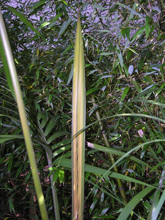 Bij deze palm is nooit precies voorspelbaar wanneer een nieuw blad uitkomt. De lengte van de speer geeft hooguit een indicatie. Vandaag was het plotseling zover en barstte de speer open. Het aangename weer zal daar niet vreemd aan zijn. Soms ook opent een speer zich in de winter bij een temperatuur van omstreeks 10 °C. Howea is geen snelle groeier met 1 à 2 bladeren per jaar, maar als je bedenkt dat deze speer 140 cm lang is, dan valt het groeitempo nog mee. Bij deze natuurlijke variatie van Howea forsteriana is het ontvouwende blad aanvankelijk bronskleurig in afwijking van de meestal lichtgroene kleur. Deze variant is herkenbaar aan de purpergetinte bladstelen en speer.