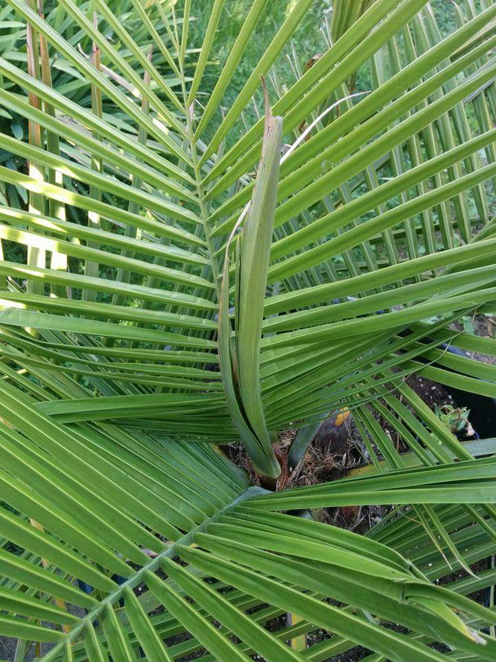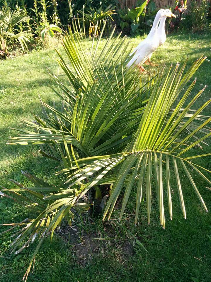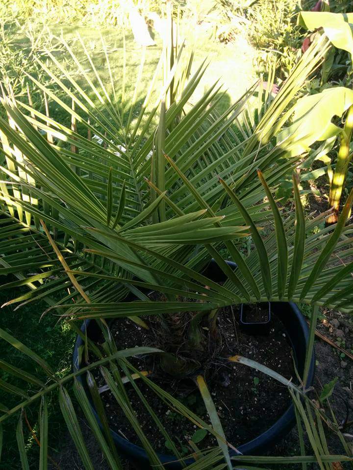 Mijn Jubaea chilensis staat hier nu 5 jaar in volle grond maar heeft het nooit denderend gedaan. 't Is te zeggen, zijn stammetje is wel dikker geworden en hij heeft flink wat mooi donkergroen blad maar hij maakt elk jaar maar een blad of 2-3 aan en de bladeren die hij dit jaar aanmaakt zijn aan de kleine kant. Iemand enig idee waar dit aan zou kunnen liggen? Hij krijgt voldoende water en in juni bemest ik de plant enkele keren met groene of blauwe korrel (ligt er aan wat ik op dat moment heb liggen) en dan eens per maand of zo gooi ik er een handje koekorrel tegenaan of ik los het eerst op in een gieter water en begiet er dan de plant mee. Begrijp me niet verkeerd, de plant ziet er erg goed uit hoor maar die weinige blad aanmaak en dan nu de opvallend kleinere bladlengtes vind ik teleurstellend. Uit ervaring met deze palmsoort weet ik dat die eens uitgeplant razendsnel zijn wortels de diepte instuurt dus na 5 jaar moet die al lang een tip top wortelgestel hebben dus had ik ondertussen toch wel snellere groei en "grotere" groei verwacht.
