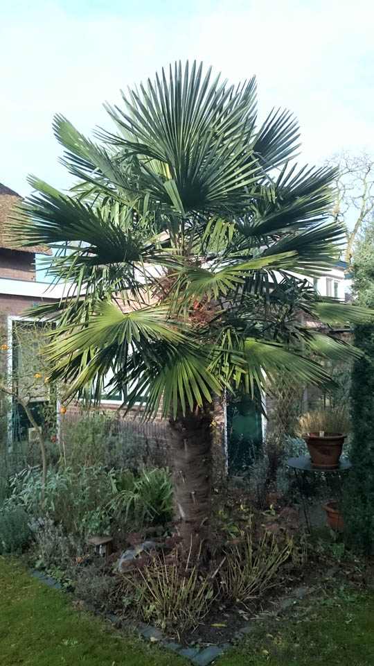 Ik ben al dik tevreden wanneer ik erin slaag om Trachycarpus voor een langere periode in leven te houden. Laat staan dat ik me zal wagen aan soorten als Washingtonia. We moeten ons niet blindstaren op de (minimum)temperatuur die een plant kan hebben. Ik heb al zo’n 30 jaar Trachycarpus in de tuin en heb ondervonden dat de oorzaken van winterschade en afsterven heel divers waren. Twee keer raakte ik deze palm kwijt als gevolg van strenge vorst met minima van -17 tot - 20°C onder nul. Ook in winters met slechts matige vorst raakten palmen soms dermate verzwakt dat ze na een gemankeerd groeiseizoen de volgende winter alsnog sneuvelden. Ik herinner me een bijzonder grillige winter met 2 achtereenvolgende vorstperiodes van een week onderbroken door eenzelfde periode met stevige dooi en veel regen. Het vroor beide periodes ‘slechts' matig dankzij een stevige Oostenwind. Het gevolg was echter dat 4 van de 5 uitgeplante palmen koprot kregen waarvan 1 exemplaar niet herstelde. De conclusie die ik hieruit trek is dat de weersomstandigheden hier zodanig divers kunnen zijn, dat er nauwelijks een voorspelling valt te doen over de absolute overlevingskans van Trachycarpus. Het klimaat in het Westen van het land is evident gunstiger voor deze palm daar de temperatuur in de kustprovincies nabij de grote steden zelden onder -10°C geraakt. Toen het in februari 2012 hier -20°C werd, wees de thermometer bij de Hortus VU -7°C aan. Het verschil werd bepaald door een vers pak sneeuw in centraal en Noordoost Nederland waardoor van de ene op de andere nacht de temperatuur daalde van -10 naar -20°C en de dagtemperatuur bij -10°C bleef steken. Een harde Noordooster zorgde voor een gevoelstemperatuur onder -25°C. Dan helpt een tent met bijverwarming ook niet, zoals een liefhebber in de buurt tot zijn verdriet ondervond. Ondanks een fraaie beschermende constructie met verlichting/verwarming ging een grote Phoenix reddeloos verloren. Van zijn uitgebreide collectie palmen en ander exotisch spul bleef na deze winter nog maar een fractie over. Op de drogere zandgronden lijkt de overlevingskans van Trachycarpus hoger dan op laaggelegen kleigronden. Het zelf gezaaide exemplaar dat ik onlangs in Brabant fotografeerde is daar getuigenis van. Maar ook hier sneuvelde al eens een groter exemplaar. Ook in Ede Gelderland staat een enorme joekel bij een exotenliefhebber.