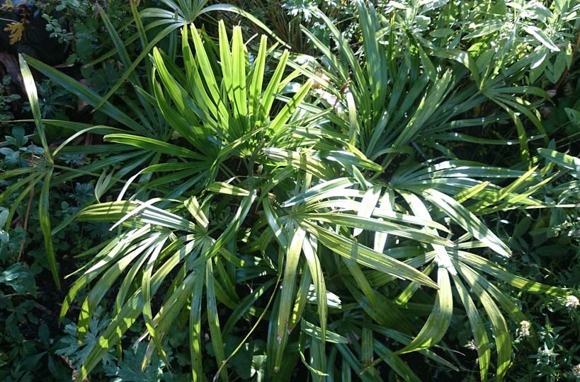 In de tuin waar ik de afgebeelde Trachycarpus fotografeerde staat overigens ook een van de oudste uitgeplante Rhapidophyllums in ons land. Vanwege de enorme bladeren vergeleken met mijn exemplaar in kuip herkende ik deze palm niet direct. De stekels op de stam waren echter onmiskenbaar. Helaas heb ik verzuimd een foto te nemen.
