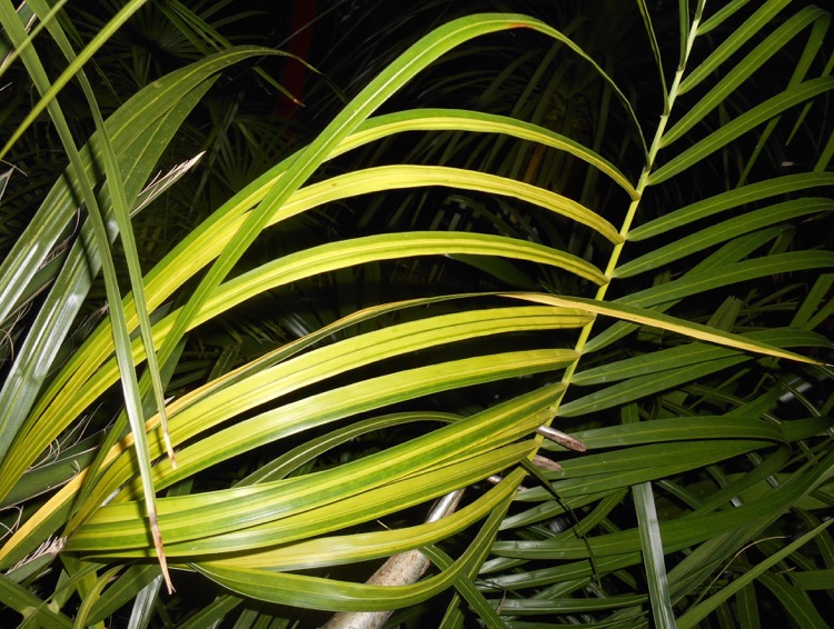 Ik heb deze Butiagrus afkomstig uit Heerde toen Gardenpalms daar nog was gevestigd. Afgelopen seizoen ontdekte ik een bont bladsegment in het laatstgevormde blad. Bij een inspectie van de kasbewoners vanmiddag, zag ik dat de nieuwste veder een hele rij van geelbonte deelblaadjes heeft. Er lijkt een spontane somatische mutatie te hebben plaatsgevonden, waarbij een deelpopulatie van de bladparenchymcellen het vermogen om bladgroen te maken is kwijtgeraakt. Wat resteert zijn vermoedelijke flavonoide pigmenten die de gele kleur veroorzaken. Een aardig detail is dat het eerstverschijnende bonte segment zich bevindt aan de rechterzijde van het blad, terwijl bij het daaropvolgende blad de bontbladigheid juist de tegenovergestelde zijde siert.