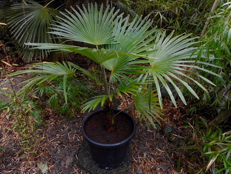 Bij mij nog steeds in pot, maar al drie jaar buiten. Ik keek er net nog naar, het is een prachtige palm aan het worden. Ik wil wel uitplanten, maar twijfel ook of het blad wel stijf genoeg is om mooi te blijven. In pot is het een pareltje maar staat half onder de overkapping.
