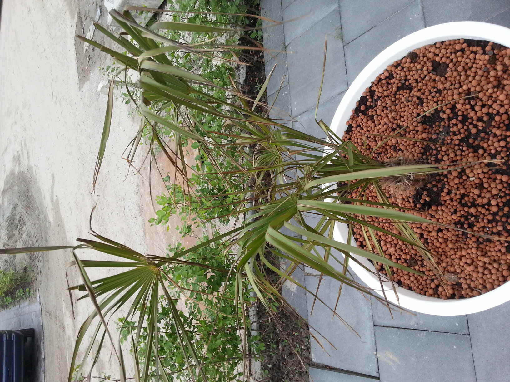 een aantal maanden geleden heb ik een Trachy Carpus van ongeveer een meter hoog aangeschaft bij Intratuin. Ik heb deze toen in een grote pot geplaatst met daarin veel drainage material.