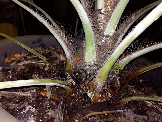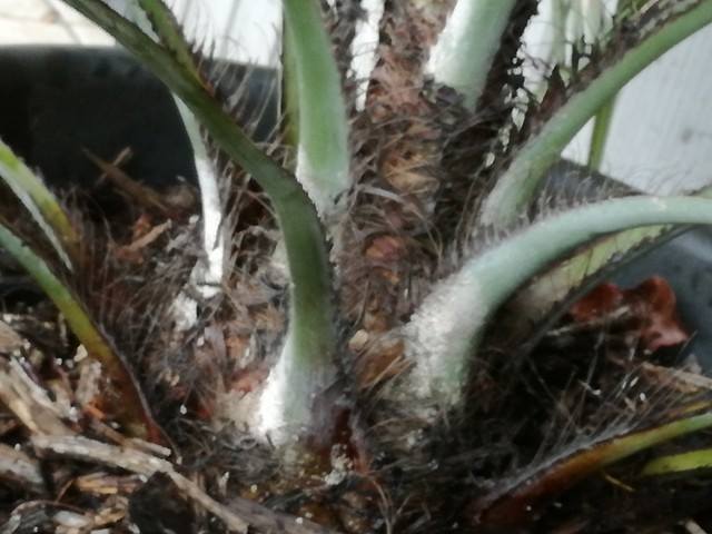Je Butia capitata ziet er ogenschijnlijk niet ziek uit, maar is mogelijk aangetast door schildluis? Op de foto is dat echter niet zichtbaar. Importplanten uit Zuid Europa hebben soms last van deze witte schildluis. Als die zich in het hart heeft genesteld is bestrijding lastig.