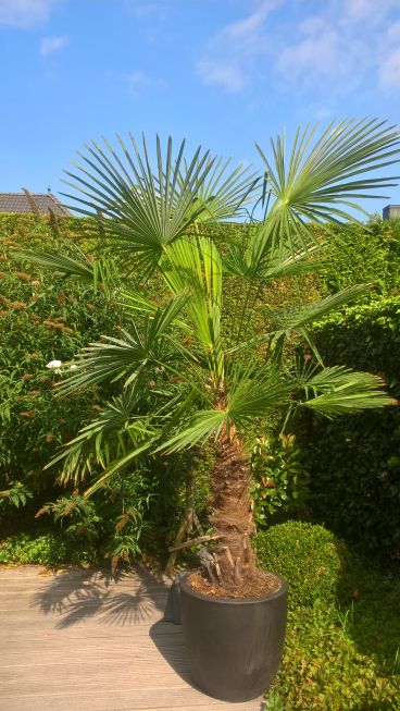 een trachycarpus fortunei in een pot .. is als uhm.. :roll: plastic tuinstoelen voor je tv.. het kan wel maar je dat doe je gewoon niet.. :lol: