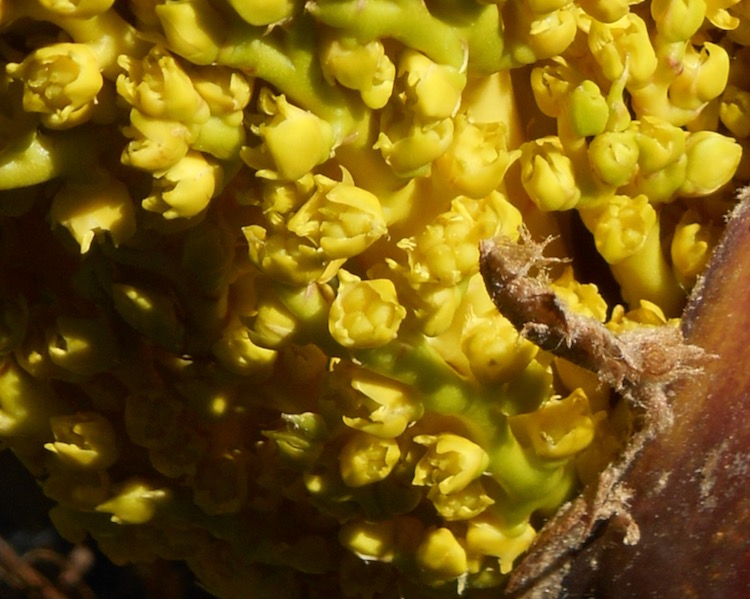 Dat is een vrouwelijk bloeiwijze. Je kunt zelf dus aan de slag met de kwast of er op het moment suprème een afgesneden mannelijke bloeikolf boven uitschudden en laten hangen. Vermoedelijk is dat binnenkort wanneer stuifmeel vrijkomt als je tegen de bolletjes tikt. Met een vergroting kun je als het goed is bij de mannelijke bloemen de meeldraden zien ( 3 sets) en vruchtbeginsels bij de vrouwelijke (3 in de pan).