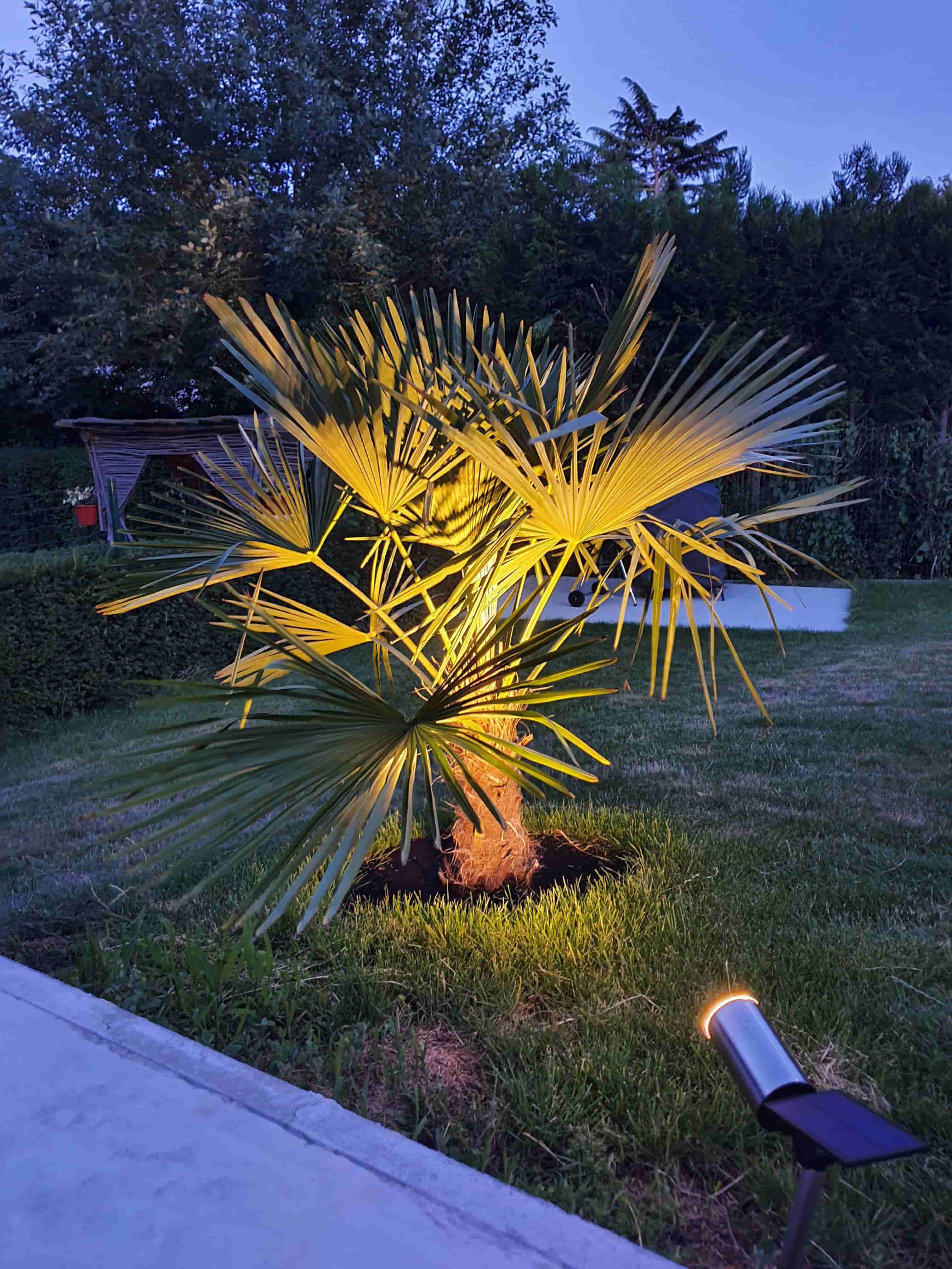 Voor wat extra sfeer heb ik er verlichting bij geplaatst. Nu vroeg ik me ook af of dit in de winter ook zou kunnen helpen tegen lichte vorst? Aangezien deze palm zijn eerste winter in de grond zal doorbrengen.