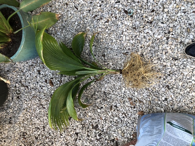 Bij deze enkele foto’s van de transplantatie van mijn Pritchardia Pacifica. Deze is na 1,5 jaar een probleem met necrose beginnen krijgen. Om dit te verhelpen, heb ik hem verplant van een mengeling van potgrond met perliet, naar een mengsel van seramis, fijne denneschors en LECA korrels (2:2:1). Op de bodem van de pot zit nu ook een laag LECA korrels.
