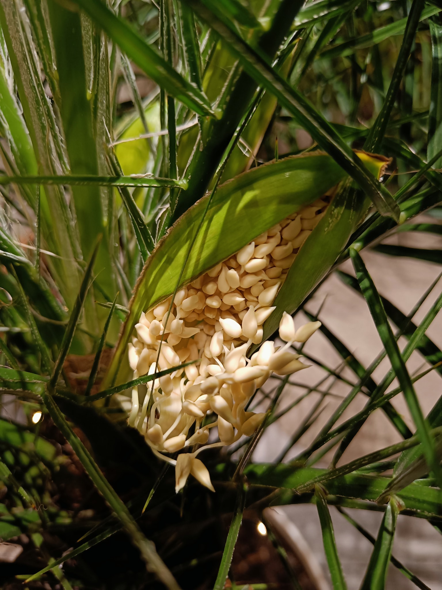 De palm heeft het kennelijk naar de zin. Dadels hoef je niet te verwachten want deze soort is tweehuizig dus is dit een mannelijk of vrouwelijk exemplaar. In het laatste geval zou je de bloemen kunnen bestuiven met pollen van een mannelijk exemplaar, te bevragen op dit forum.