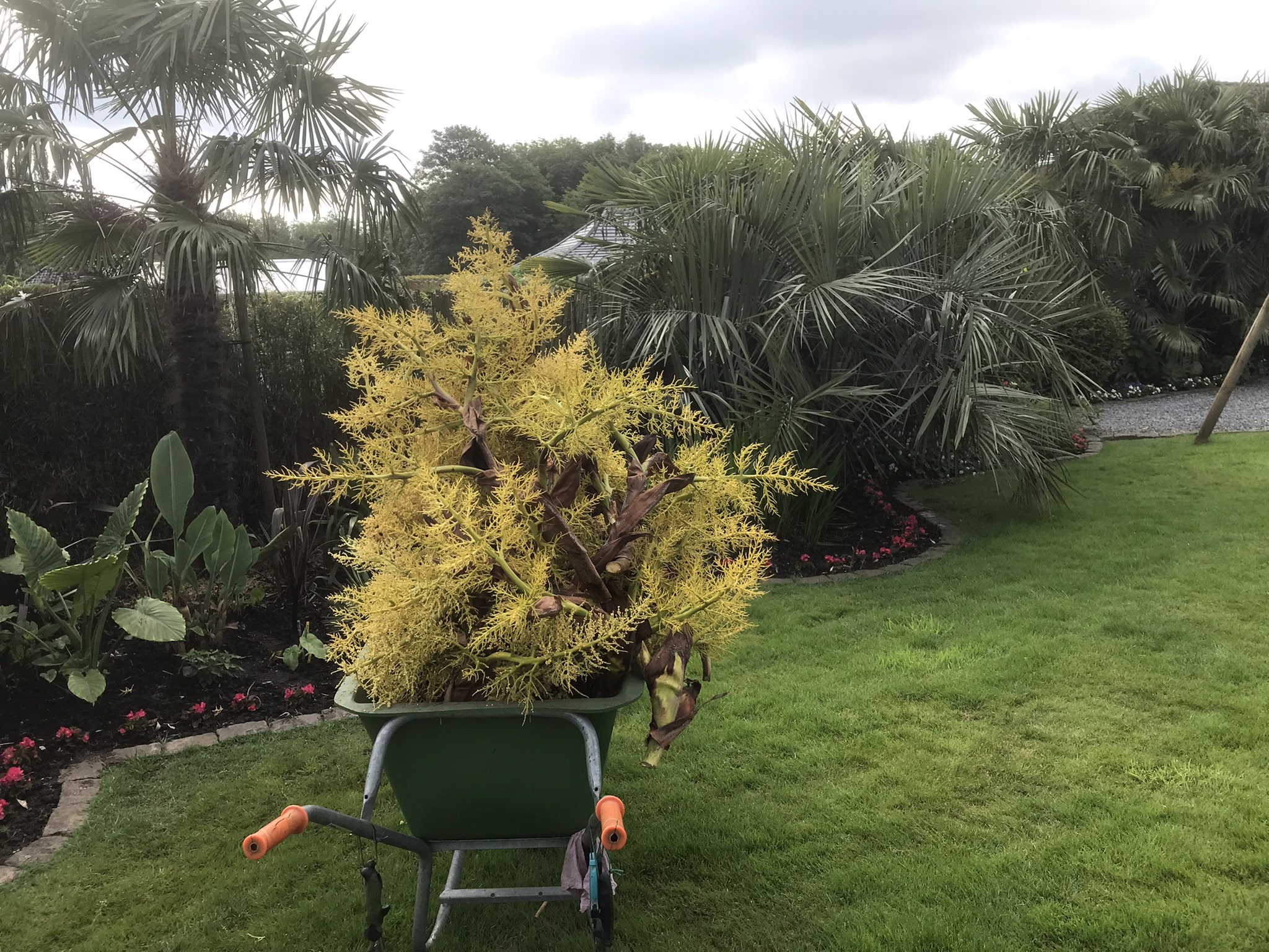 ik heb gisteren een deel van mijn mannelijke trachycarpussen gesnoeid, er kwam een heel deel af. De voorbije weken hebben de bijtjes in grote getallen hun werk gedaan om de vrouwtjes te bevruchten.Dit is het resultaat van een vijftal bomen, en in totaal heb ik er meer dan 50 staan