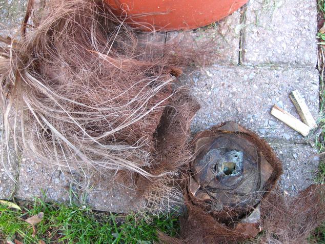 Deze heb ik nu teneinde raar alle 2, stukje per stukje afgeslepen (zagen gaat zo moeilijk met al dat haar ). Een heb ik ong. een halve meter afgedaan waardoor er nog maar een 20cm vanover gebleven is tot op het mooi hout, bij deze niet veel hoop meer . :cry: