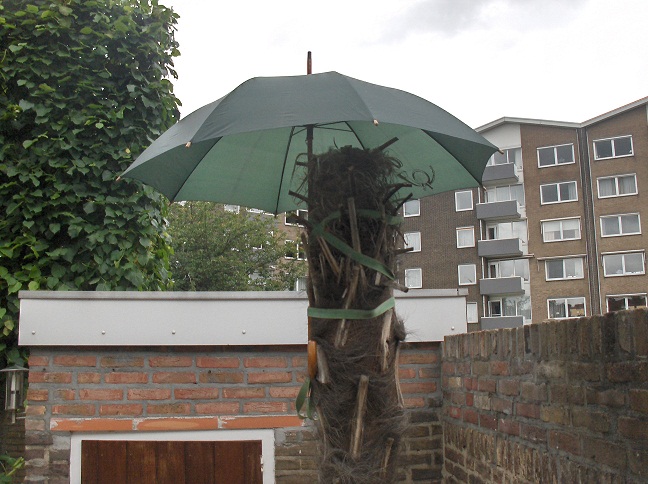 Dimi: ik heb je raad opgevolgd en de paraplu verwijderd... vind het wel nog wat eng aangezien er naast de speer veel vezels zitten die het zaakje vochtig houden. Als het gaat regenen doe ik de paraplu toch maar weer erboven. Ben als de dood dat het alsnog mis kan gaan!