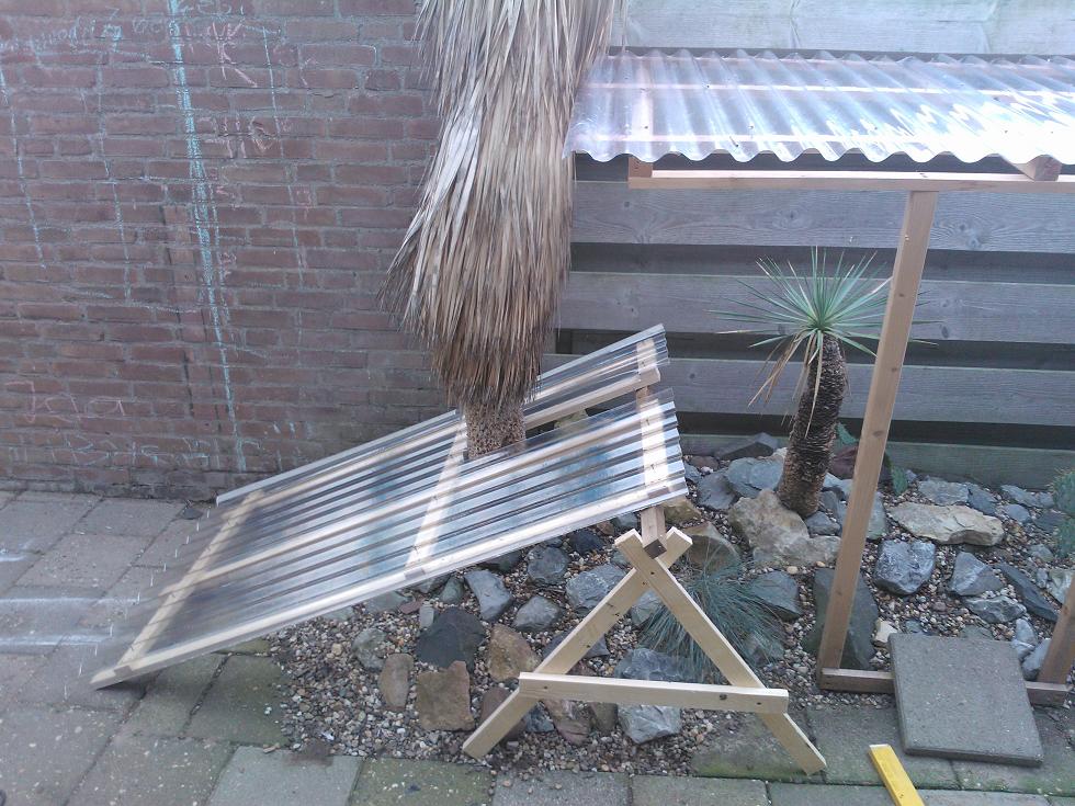 vandaag eens bezig geweest met het laatste deel van de afdaken boven de rotsstrook. tussen de reuzen uit Reuver is het mooi dicht, resteren de kluiten van deze grote rostrata's. nu wou ik perse iets demontabels en tevens de golf van de platen haaks op de rest ivm afwatering. vorig jaar waterde het af tegen de stam en dat is niet ideaal. als het klaar is, is het uiteraard simpel maar vooraf toch even zitten dubben hoe het nu doeltreffend en degelijk te krijgen. de eerste is klaar de tweede volgt na het weekeinde wel. simpel frampje van panlatten met golfplaat erop geschroefd dusdanig dat ik m zo eraf kan pakken en straks met de rest weg kan zetten voor volgend jaar ;)