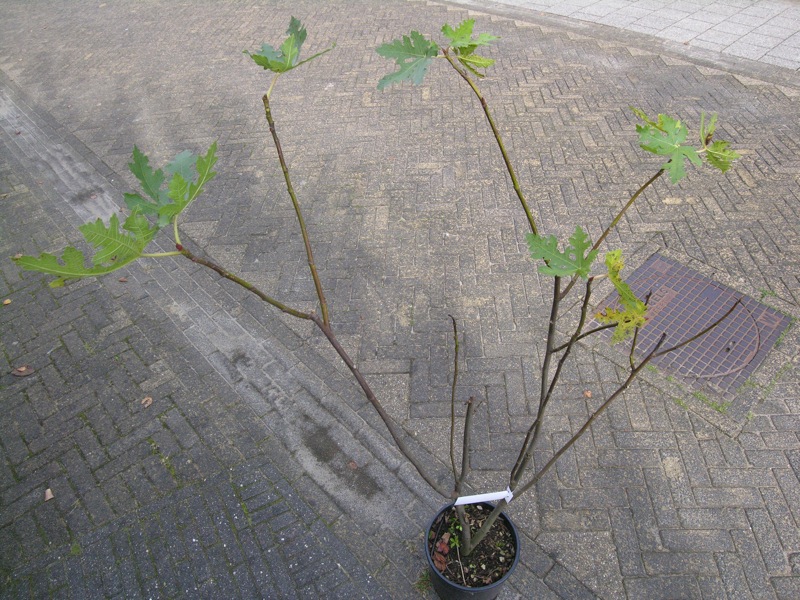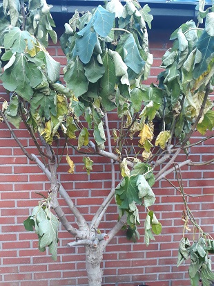 Ik heb dit weekend een flinke vijg over kunnen nemen van iemand. Vrijdag uit de grond gehaald, zaterdag opgehaald en bij mij in de grond. De wortels lijken niet noemenswaardig beschadigd. Mijn andere vijgen hadden intussen hun blad al grotendeels verloren, maar deze bleek nog vol in blad te staan. Het verplanten vond hij dus niet zo leuk: