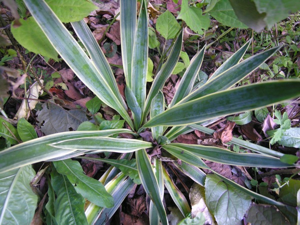 Wat mij over de bontbladige yucca's bekend is heb ik opgesomd op 21 oktober. Ik heb verder nog een witbonte vermoedelijke gloriosa met een purperen gloed waarvan ik de benaming niet weet. Zelf vind ik de Yucca filifera 'Bright Edge' erg fraai met de smalle bladeren. Het uit Italië (?) geïmporteerde exemplaar was pittig geprijsd, maar in het najaar lukt het vaak wel om korting te bedingen.